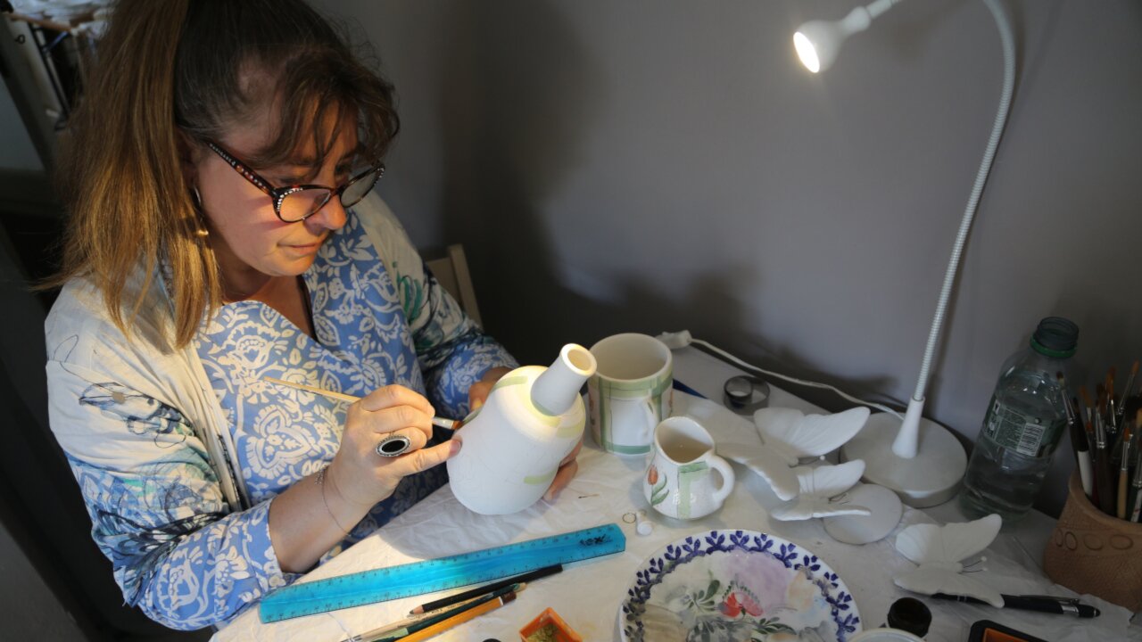 Aurora Vena dipinge e modella la ceramica da più di 30 anni e, dal 2023, ha la sua bottega nel cuore di Chiusa Pesio, dove è possibile vederla lavorare e ammirare pezzi unici realizzati con maestria e passione.